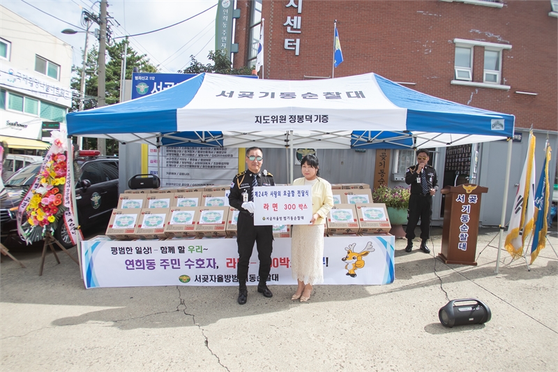 The Siheung City Seogot Autonomous Crime Prevention Mobile Patrol (Captain Choi Dong-yeop) delivered 300 boxes of ramen to the Yeonhui-dong Administrative Welfare Center on the 12th through the '24th Love Fund Delivery Ceremony' on the occasion of its 46th anniversary this year, asking that they be given to neighbors in need and low-income families in the area.