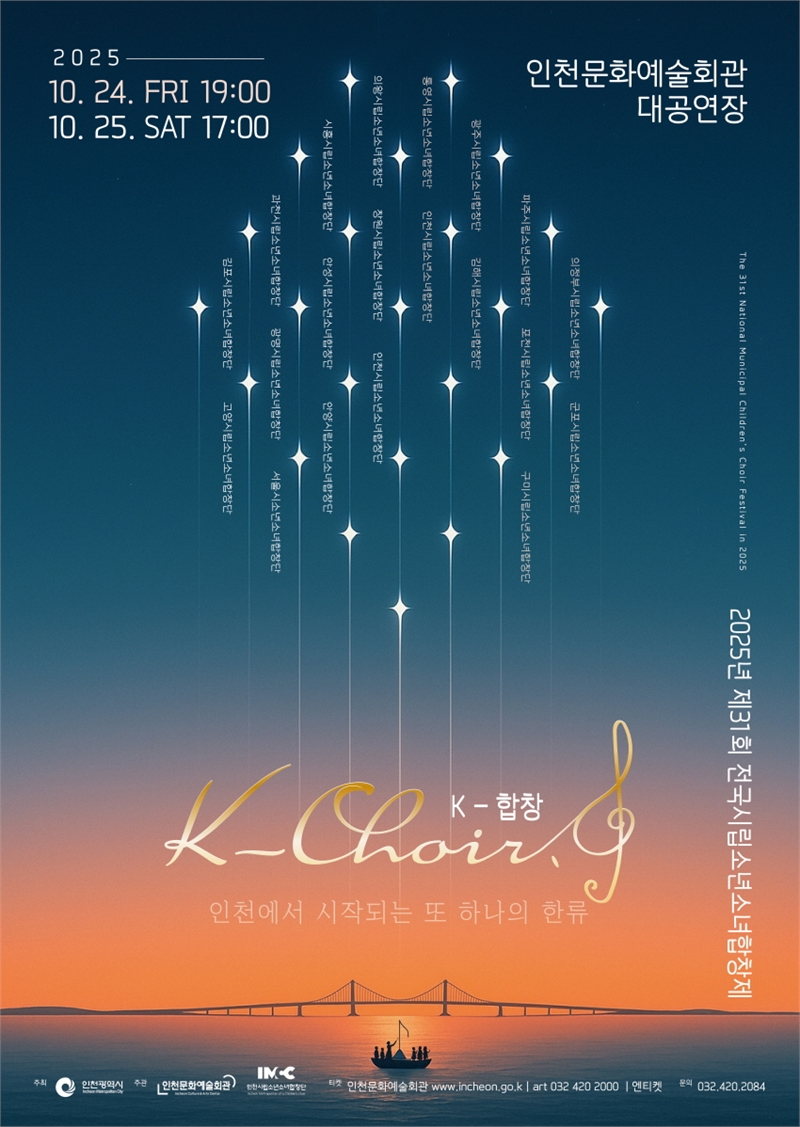 제31회 전국시립소년소녀합창제가 10월 24일부터 25일까지 이틀간 인천문화예술회관 대공연장에서 열린다. 1992년 시작된 전국시립소년소녀합창제는 매년 여러 도시를 순회하며 개최되는 전국 단위의 음악 축제다. 올해는 인천문화예술회관 리모델링 재개관을 기념해 인천에서 개최한다. 전국 각지에서 모인 시립소년소녀합창단 1,300여 명의 단원들이 참가한다. 총 20개 팀의 공연이 펼쳐진다. 주최 도시인 인천시립소년소녀합창단은 양일간 무대에 오른다.