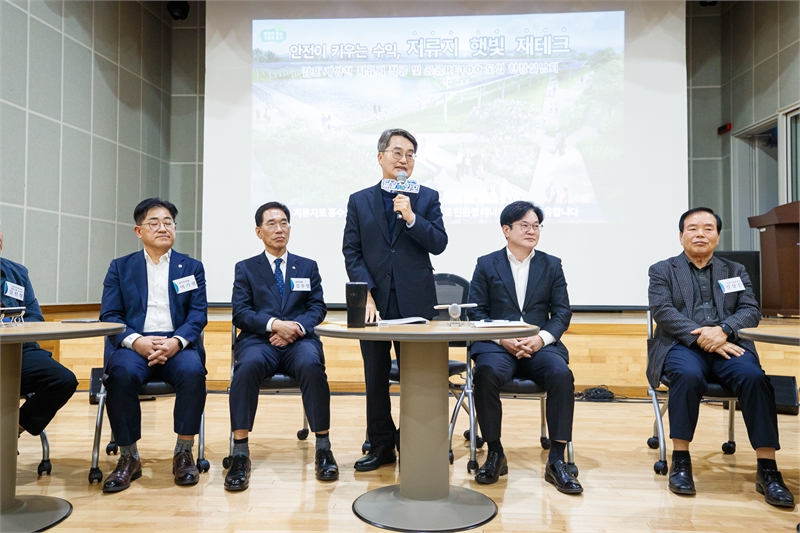 Governor Kim explained, "We will install solar panels on top of the retention basin to create a solar power plant. Gyeonggi Province is most actively responding to the climate crisis and renewable energy." Gyeonggi Province will install 565 solar panels in the Gyeyang Stream retention basin. The generation capacity is about 10.8MW, with annual production reaching about 15GWh. This is enough electricity for 4,000 households of four people to use for one year. Governor Kim emphasized, "This is a project where residents can participate as cooperative members and receive profits from power generation. It is a triple-win project." Gyeonggi Province plans to organize a profit-sharing cooperative consortium with over 50,000 residents participating and distribute power generation profits to participating residents. Expected revenue is 3.4 billion won per year.