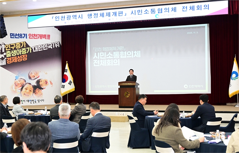 인천광역시는 11월 3일 인천시청 대회의실에서 '행정체제개편 시민소통협의체 전체회의'를 열었다.