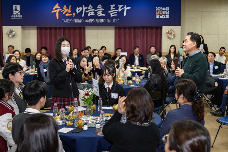 Youth are actively participating in the 2025 Saebit Meetings. About 30 students from Cheongmyeong High School participated in the Yeongtong 1-dong Saebit Meeting held at Yeongheung Arboretum on October 21. Students from Songwon Middle School and Cheoncheon High School joined the Songjuk-dong Saebit Meeting on October 24. A Cheongmyeong High School student proposed, "Please allow Cheongmyeong High School students free admission to Yeongheung Arboretum." The Saebit Meeting is where Mayor Lee Jae-jun visits all 44 dongs in Suwon City to listen to residents' voices. It continues until December 4.