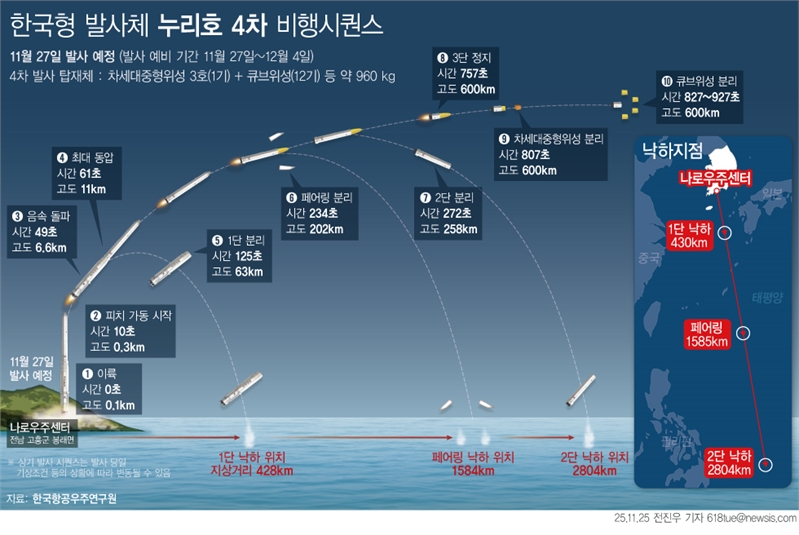 The Yeosu Coast Guard announced on the 25th that it will implement maritime control around Naro Space Center ahead of the 4th launch of Korea's indigenous Nuri rocket scheduled for 1 AM on the 27th. The Yeosu Coast Guard will completely block vessel traffic within the maritime control zone from 2 hours before launch until 10 minutes after launch. The maritime control zone covers waters within a 3㎞ radius of the Naro Space Center launch pad and the Nuri rocket flight path area, spanning 24㎞ in width and 78㎞ in length. The Yeosu Coast Guard established the control zone in preparation for emergency situations such as launch vehicle descent.