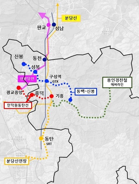 용인경전철 광교 연장사업은 기흥역에서 흥덕을 거쳐 광교중앙역까지 총 6.8km를 연장하는 사업이다. 사업비는 약 7천47억 원이다. 기흥역의 분당선·용인경전철과 흥덕역의 인덕원동탄선, 광교중앙역의 신분당선을 연결한다. 동백신봉선은 동백역에서 GTX 구성역, 성복역을 거쳐 신봉동까지 총 14.7km를 잇는다. 사업비는 약 1조7천820억 원 규모다.