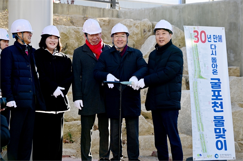 ◆ 30년 숙원사업 결실인천광역시는 12월 4일 굴포천 자연생태하천 복원사업 준공을 앞두고 물맞이 행사를 개최했다. 인천시는 이날 하천유지용수를 처음 공급했다. 굴포천 복원사업은 인천 제1호 하천복원사업이다. 1990년대 도시화 과정에서 콘크리트로 복개된 굴포천을 자연형 생태하천으로 되살리는 사업이다.